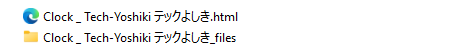 保存すると、この↓ようにファイルが1つ、フォルダが1つできます。次回からは保存したファイル(HTMLファイル)を開けば、すぐに時計が動きだします。