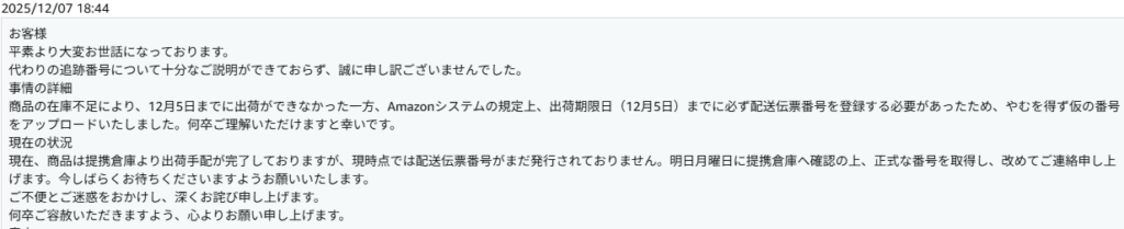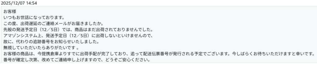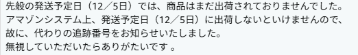 つまり、出荷予定日の5日に出荷できなかったけど、アマゾンには出荷したことにしないといけないので、代わりに他の(ウソの)追跡番号を報告した、なので、無視してくれ。と。。。え? 嘘の出荷報告をしたと認めてるんでしょうか? そして、その番号は無視してください。と?