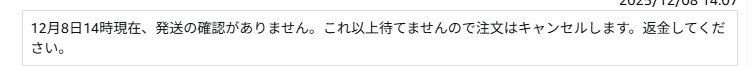 どいつもこいつも、、って感じになってきました。もういいやってことで、私からもキャンセルするので返金しろとメッセージを送りました。