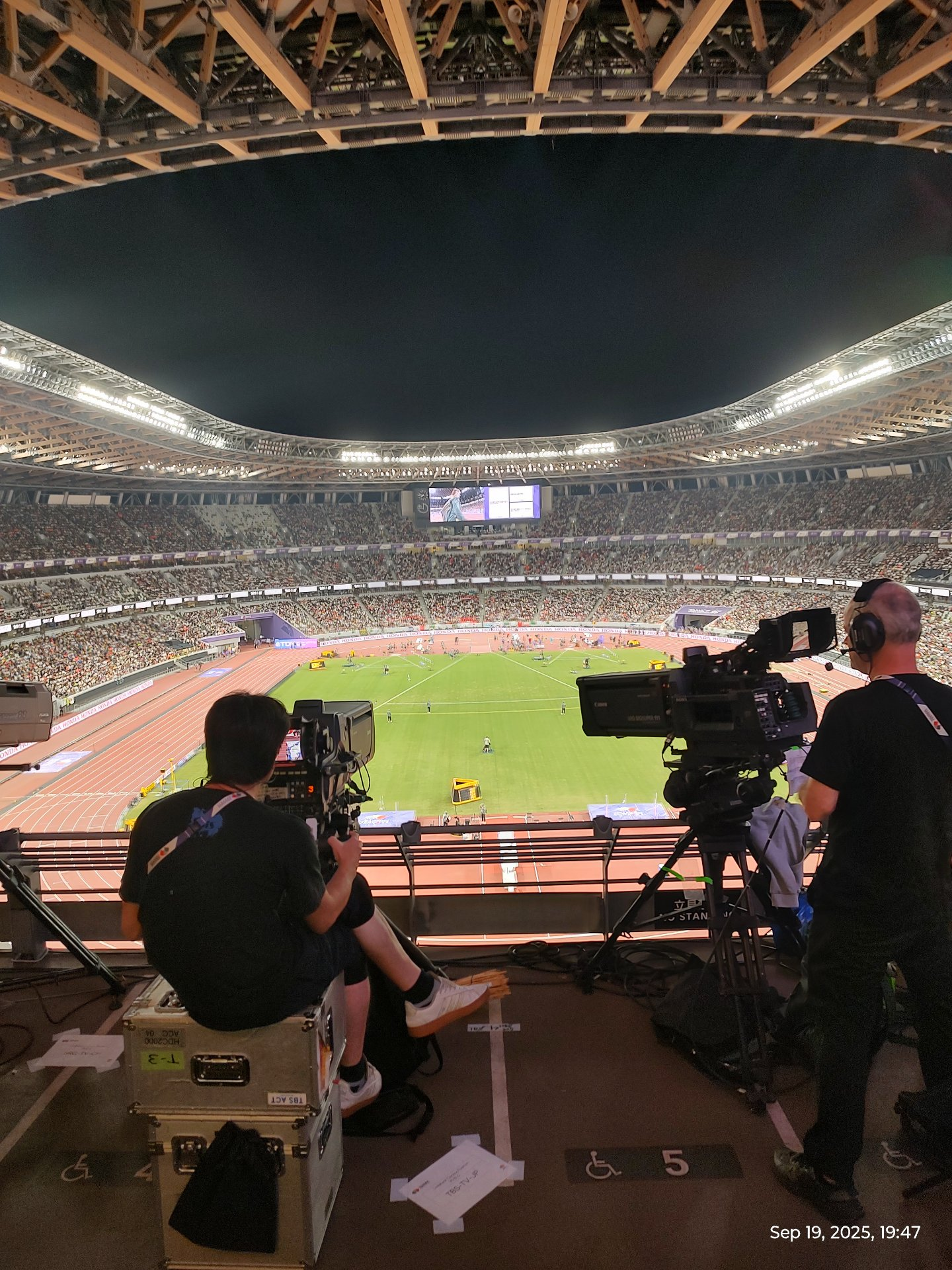 ふとゴール付近に目をやるとちょっとしたスタジオっぽいのが見えます。双眼鏡で覗いてみると、あ、織田裕二だ(笑)後ろ姿が見えます。その隣には各メディアのブースがあってここで選手にインタビューするんですね。なるほどー テレビで見てたやつの裏側が見える感じで面白いです。それにしてもカメラマンの数がすごい。100人くらいいるんじゃ?と思うくらいです。さすが世界陸上!