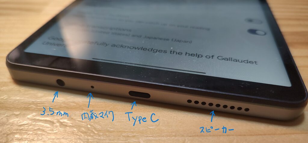 左から、3.5㎜の穴、内臓マイクの穴、充電用のType C、そしてスピーカーの音が出てくる穴です。