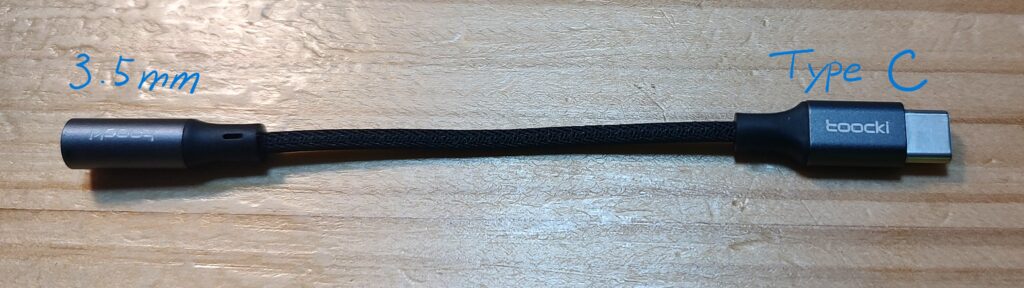 ここまでは、3.5㎜の穴があるスマホ、タブレットの場合の話でした。では、穴がない場合は?というと、その場合は充電端子(Type C)を代わりにつかいます。「USB 3.5㎜変換ケーブル」でググればいろいろ出てきますので1つ買ってください。お値段は1000円ちょっとです。(注:100均ショップで売っている格安(300円くらい)の変換ケーブルは外観は同じですが、実は中身が違うので使えません。ご注意ください。)例えばこんなやつです。