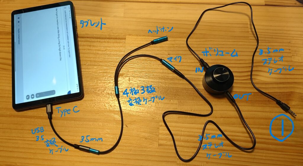 さて、動作原理を説明しますと、まずPCからの音声がボリュームに入ります。ここで音のレベルを下げます。その出力が変換ケーブルでマイク入力に変換されて、USB3.5㎜変換アダプターに入り、タブレットに入ります。実はボリュームがなくても動作するのですが、その場合は、タブレットのマイク入力に過大な音が入ることになるので、あまりよろしくありません。過大な音が入力されると音が歪んだりして、書き起こしの精度が落ちることになります。またタブレットに過大な負荷がかかりますので、その点でもよろしくありません。ボリュームを回して書き起こしができる最適なレベルに調節してください。