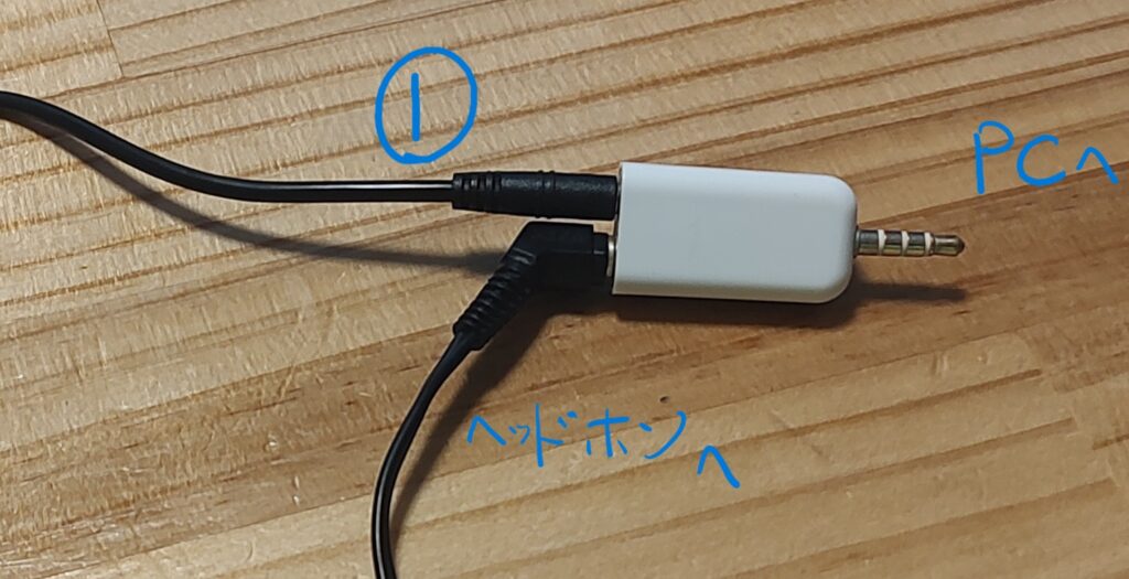 1. PCからの音声をスマホ又はタブレットのマイク入力に入れてやるために4極3極変換ケーブルを使います。