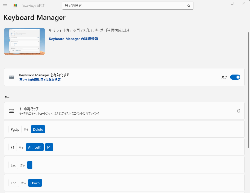 「キーの再マップ」をクリックするとキーをマッピングを変更する画面が出てきます。