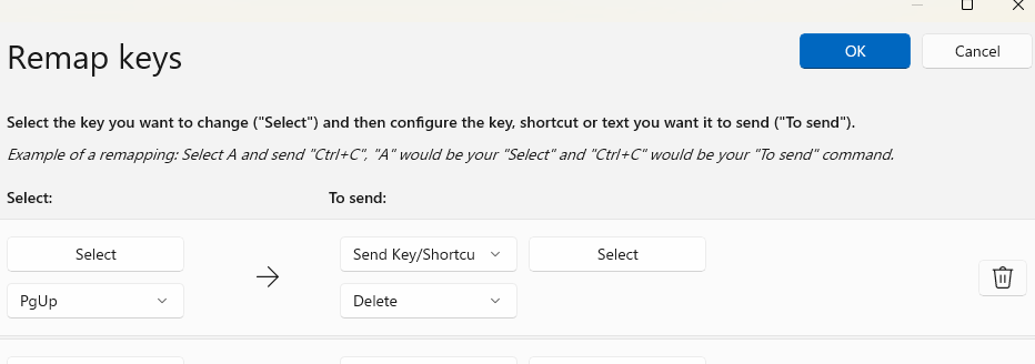 例えばここではPgUpというキーにDeleteの機能を割り当てています。設定が済んだらOKをクリックして終了です。