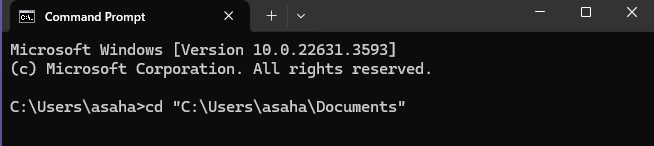 次にコマンドプロンプトに戻り、cd と打ち込んだ後にペーストしますとこんな感じになります。㏅とはchange directoryの意味で、このパスのフォルダに移動するという意味です。