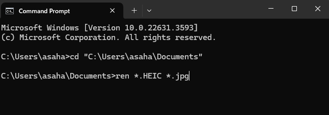 ここでは ren *.HEIC *.jpgというコマンドを入れます。 renとはRenameの意味で、 * は、ワイルドカード(なんでもいいと言う意味)です。 これで、「なんとかかんとか.HEIC」というファイルはすべて「なんとかかんとか.jpg」という名前に変更する、という意味になります。このコマンドをファイルが置いてあるフォルダ上で実行すればいいわけです。